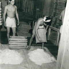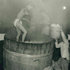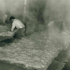 The steamed rice, cooled to the right temperature, is placed into the koji room (kojimuro) at a constant 30°C. The koji mold is evenly spread over the rice, and for about 48 hours, the mold is carefully cultivated to grow uniformly.